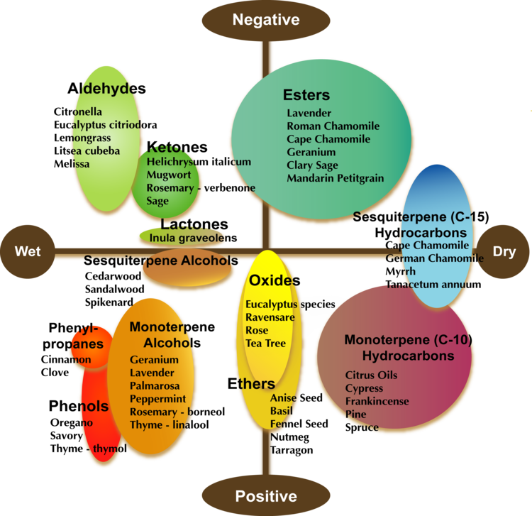 Esters are a functional group, defined by Wikipedia as “a group of atoms in a molecule with distinctive chemical properties.” In essential oil Functional Group Theory (FGT), popularized by Pierre Franchomme, the functional groups are used to describe the therapeutic properties of the oils containing the identified compounds. According to FGT, esters are calming. As I stated earlier, lavender, Cape chamomile, etc. are calming due to their main structure being esters. A recent claim among industry experts is that FGT is BS. Therefore, my statement claiming the functional group of ester compounds to be calming would be BS, based on these professionals claiming FGT as BS. FGT does have some legitimacy, so outright dismissing it as a useful theory is BS. I use the functional group structure-effect diagram (see above) as a teaching tool. When used as a teaching guide that addresses the flaws, FGT is a valuable guide when learning essential oil chemistry and for choosing essential oils. You do find companies and blog writers misinterpreting the use of FGT and GC analysis, suggesting BS explanations of the chemistry and properties of essential oils.