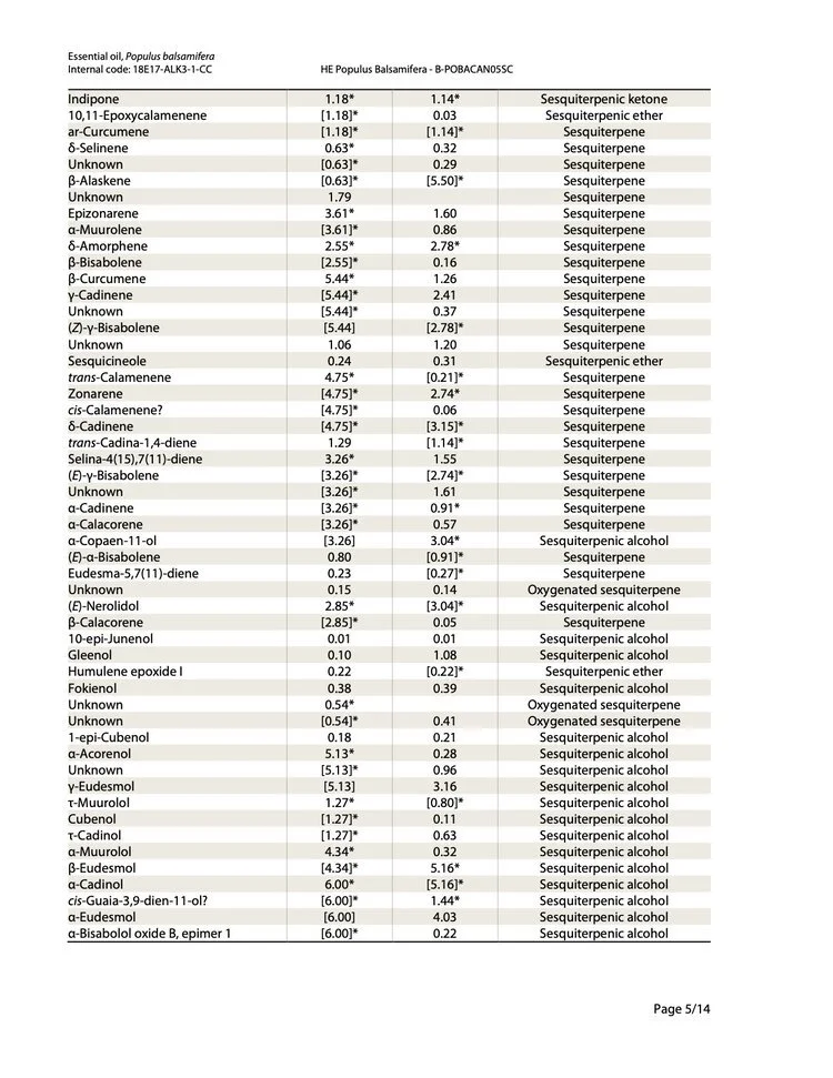 1 of 4 pages listing the identified compounds from the Balsam Poplar GC chromatograph. This is not at all similar to the simplified versions shown on sellers websites. Though only an expert in GC analysis will be able to detect adulteration, this information is helpful for therapeutic analysis to the trained essential oil expert who understands the chemistry. See my book Easy Essential Oil Chemistry.